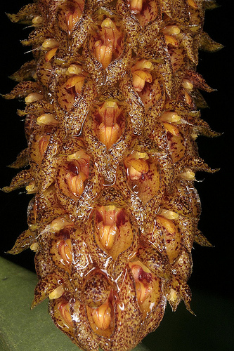 The FlowerFlowers small, about 1.2 cm long, pedicellate. Sepals unequal, dorsal very small, oblong; lateral more than twice longer than the dorsal, ovate, acute, converging at its apex. Petals small, broadly triangular. Lip half the size of the lateral sepals, curved, disc channelled from its base to the middle, edges minutely ciliolate. Column with two apical teeth. Floral bracts longer than the ovary, lanceolate. The outer surface of the sepals are of shinning brown with even darker marks throughout, inner side is pinkish brown with uneven darker markings. Petals pinkish brown. Lip reddish pink fading to its apex and margins. Column brilliant yellow. Pedicel bright red, scape greenish red, floral bracts pale brown.