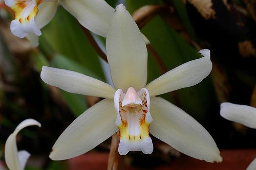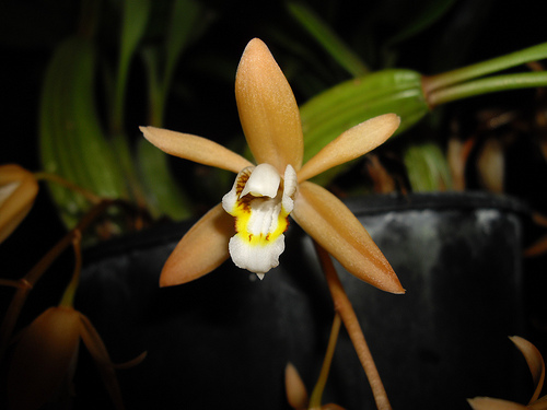 ![]() | Coelogyne flaccida | Sepals and petals are orange. Lip is white |