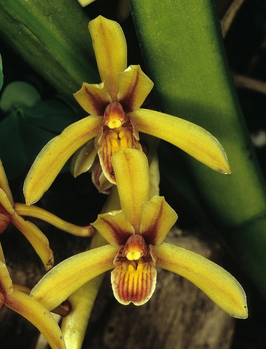![]() | Cymbidium aloifolium | Sepals are yellow and petals are yellow with a red stripe, lip is yellow with red stripes |